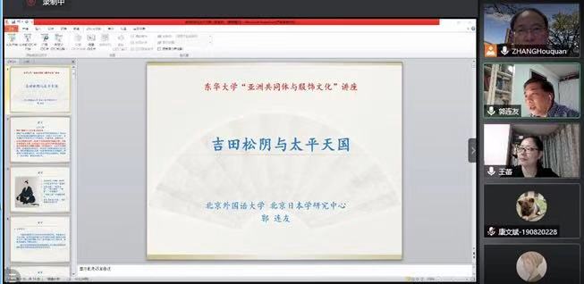 11月17日,北京日本研究中心原中心主任郭连友教授应邀通过在线方式为必一运动官方网站师生举办了一场题为“吉田松阴与太平天国”的学术讲座,必一运动官网及兄弟院校70多名师生参加了本次讲座。