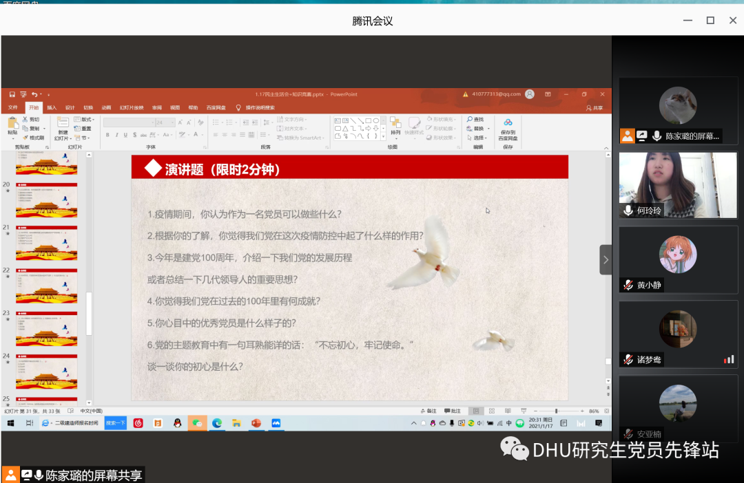 为深入学习四史知识,于学思践悟中坚定理想信念、于奋发有为中践行初心使命,营造“知史爱党、知史爱国”的良好氛围,20硕团支部于1月17日举办学习“强”国,抗“疫”到底四史知识线上知识竞赛。支部成员积极响应,精心准备,呈现了一场精彩的四史知识竞赛。