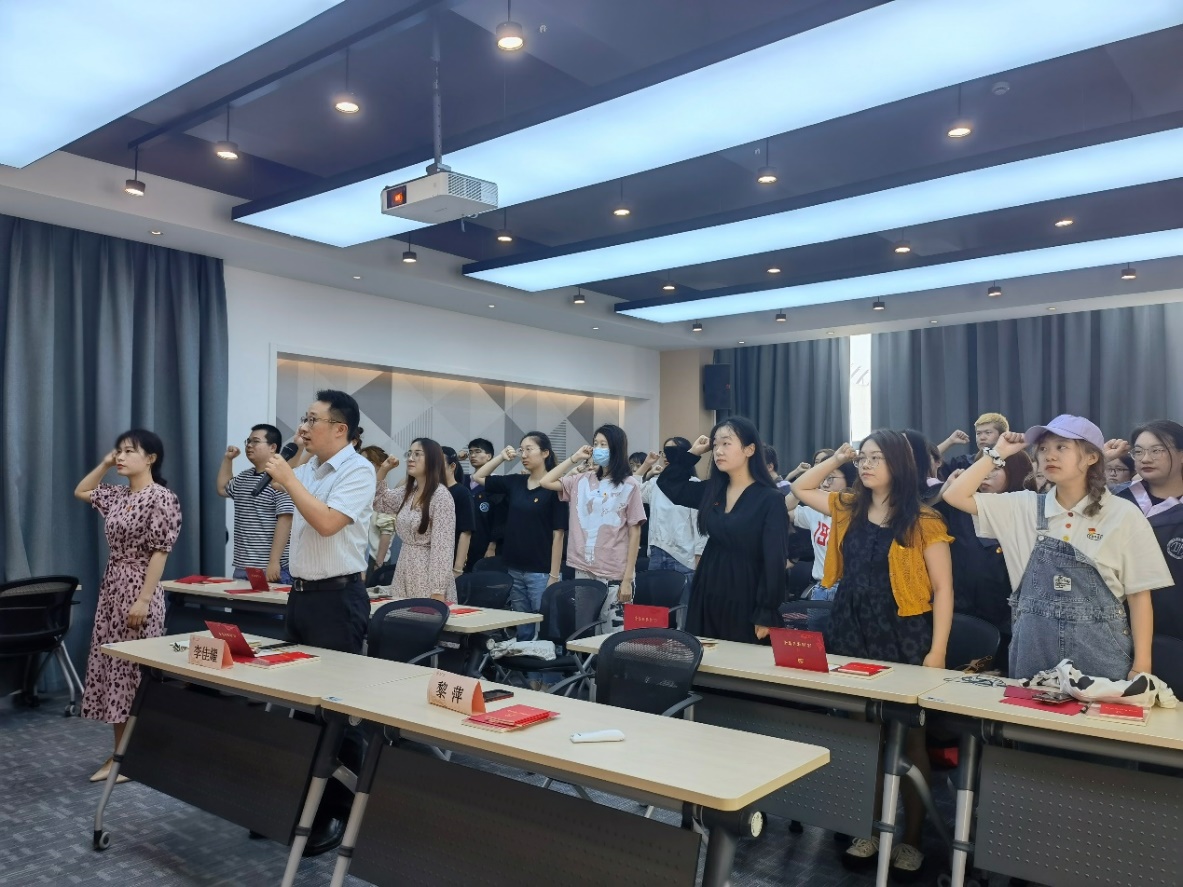 在庄严的《国际歌》中,新发展党员入党宣誓仪式举行。在领誓人的带领下,全体新发展党员面对鲜红的党旗高举右手,齐肩握拳,庄严宣誓,宣告自己对党忠诚的决心和承诺。全体毕业生党员重温入党誓词,重忆入党初心,坚定理想信念。