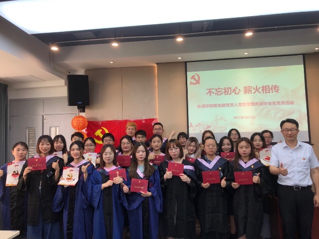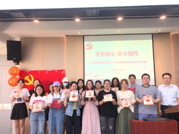 新发展党员代表19级英日复语班王博同学表示,在建党100周年之际,自己成为一名光荣的共产党员,感到万分荣幸,在今后的学习和生活中,将时刻以党员的标准严格要求自己,不断进取,用实际行动践行初心使命。