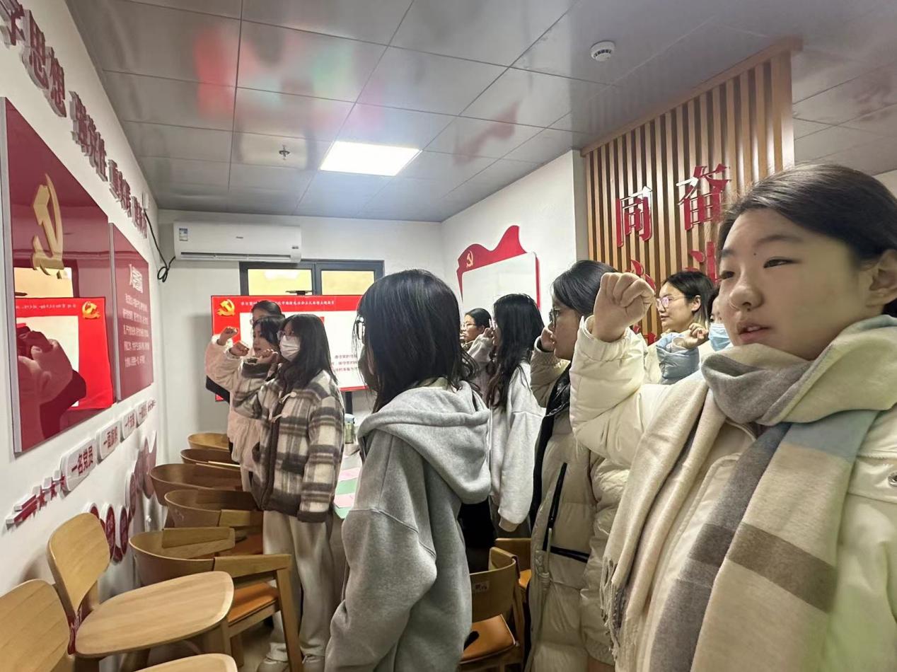 陈肖霞领誓,带领新党员面对鲜红的党旗,举起右手,慷慨激昂、坚定有力地向党组织做出庄严承诺,掷地有声地发出了“为共产主义奋斗终身”的坚定决心。与会党员与新党员一同宣誓,重温了入党誓词,23硕党支部和毕业班党支部的党员代表为新发展党员佩戴党徽,象征党员的责任与使命薪火相传,引导新党员增强党性意识。