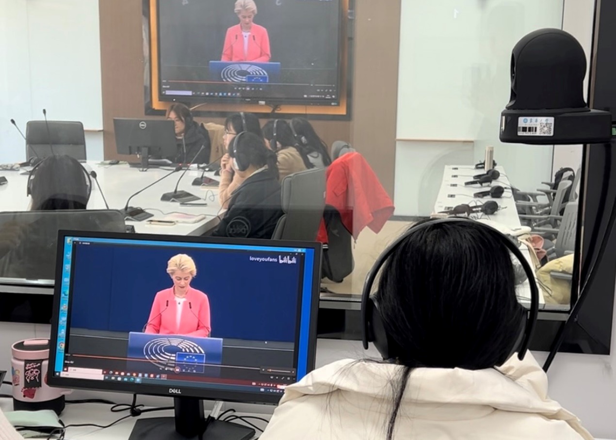 在同传实验室里上课是一种全新的体验,感受到不一样的学习模式。如果说以前教室授课的模式是在学习知识,那么在实验室中更是学会如何在实践中运用知识。进入同传间,带上耳机,就能感受到紧张的氛围,最大程度让我们发挥出潜力,发现不足。这段时间在同传实验室的学习,不仅新奇,而且受益良多!