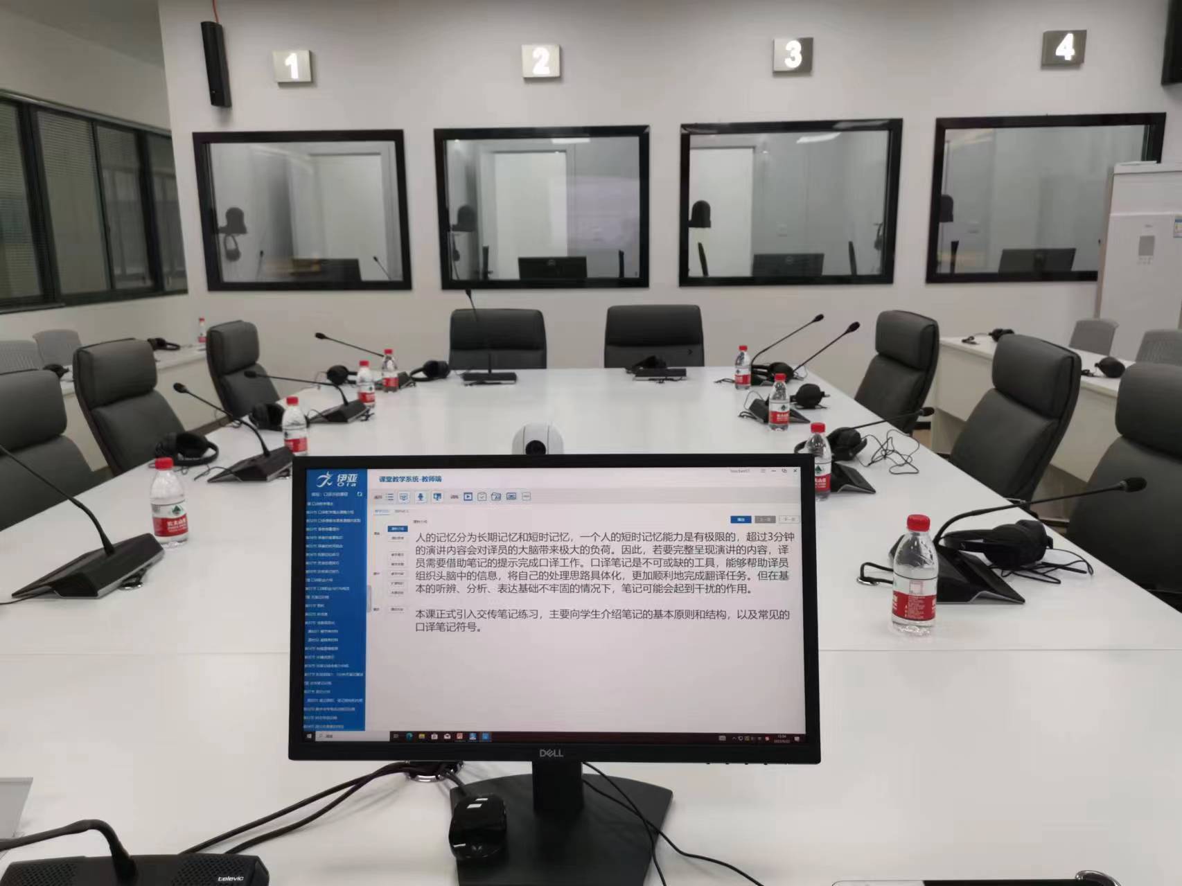 同传实验室敞亮的会议间以中间发言区为核心,每个座位上都配备有发言话筒和耳机,只需轻按桌上的按钮,即可畅所欲言。四个同传间贴合译员的工作环境,让我们能切身实地感受到同传的工作氛围,在训练中自信在不断增强。