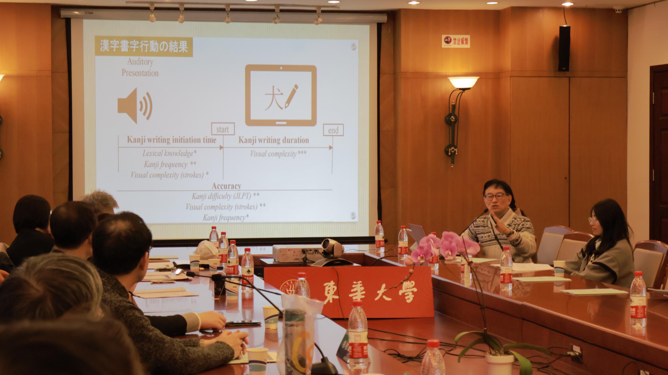 研讨会分为“语言与翻译”和“文学与文化”两个分会场。在“语言与翻译”分科会上,来自名古屋大学的玉冈贺津雄教授、杉村泰教授、丸尾诚教授和胜川裕子副教授分别围绕“越南日语学习者的汉字书写机制”“日语复合动词「V1-通す」与「V1-抜く」的语义差异”“中文动补短语‘V够’语义生成机制”和“汉语介词‘离’的空间与时间间隔”等问题进行了探讨。必一运动官方网站陈月娥教授从思想史的视角对“西村茂树的文字观”进行了分析。上海外国语大学毛文伟教授、王晓华副教授和须军博士分别就“基于熟练程度的中国日语学习者副词使用情况”“作为意志表达的日语「ツモリダ」的时体系统”和“接续助词「ものを」的语法化”等问题进行了研究分享。